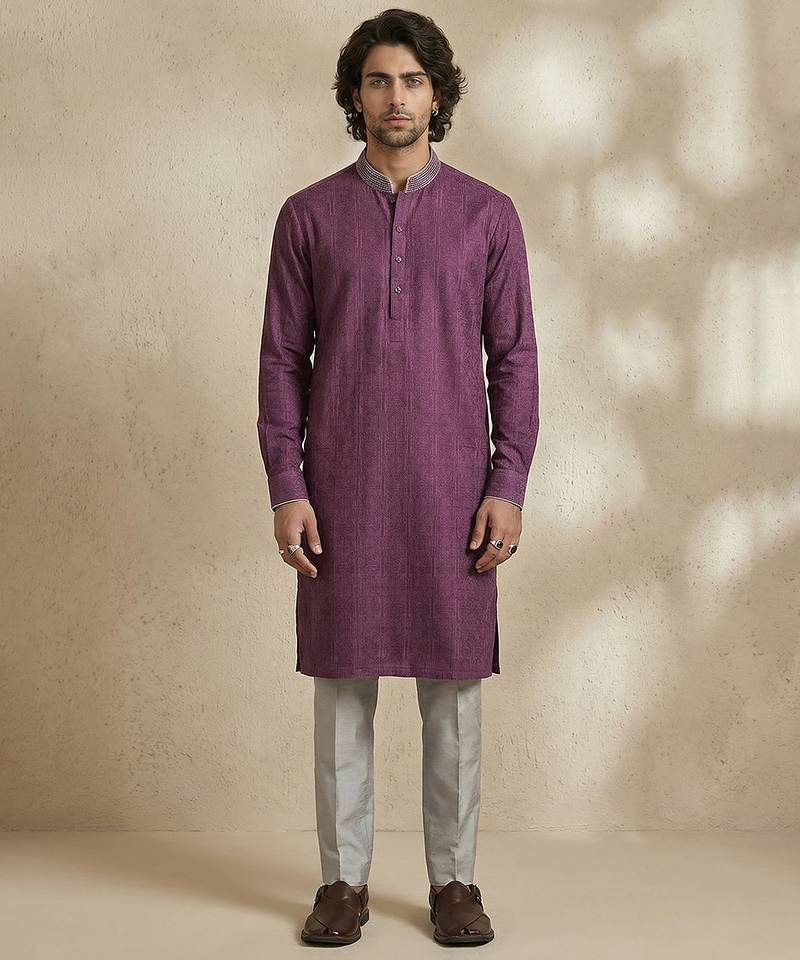 Purple Woven Cotton Kurta Set Radiates Elegance And Comfort In One Ensemble. Made From Soft, Breathable Cotton, The Kurta Features A Subtle Woven Texture That Enhances Its Sophisticated Appeal. Ideal For Festive Occasions, Formal Events, Or Casual Gatherings, It Pairs Perfectly With Matching Bottoms For A Refined, Versatile Look.