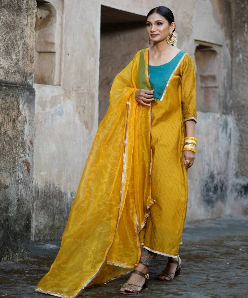 1- Semi chanderi kurta with pintuck detail all over. 2- Chanderi yoke highlighted with potli buttons & zari laces. 3- Narrow pant with half elastic & half belt 4- Organza dupatta 5- Pure mul cotton lining