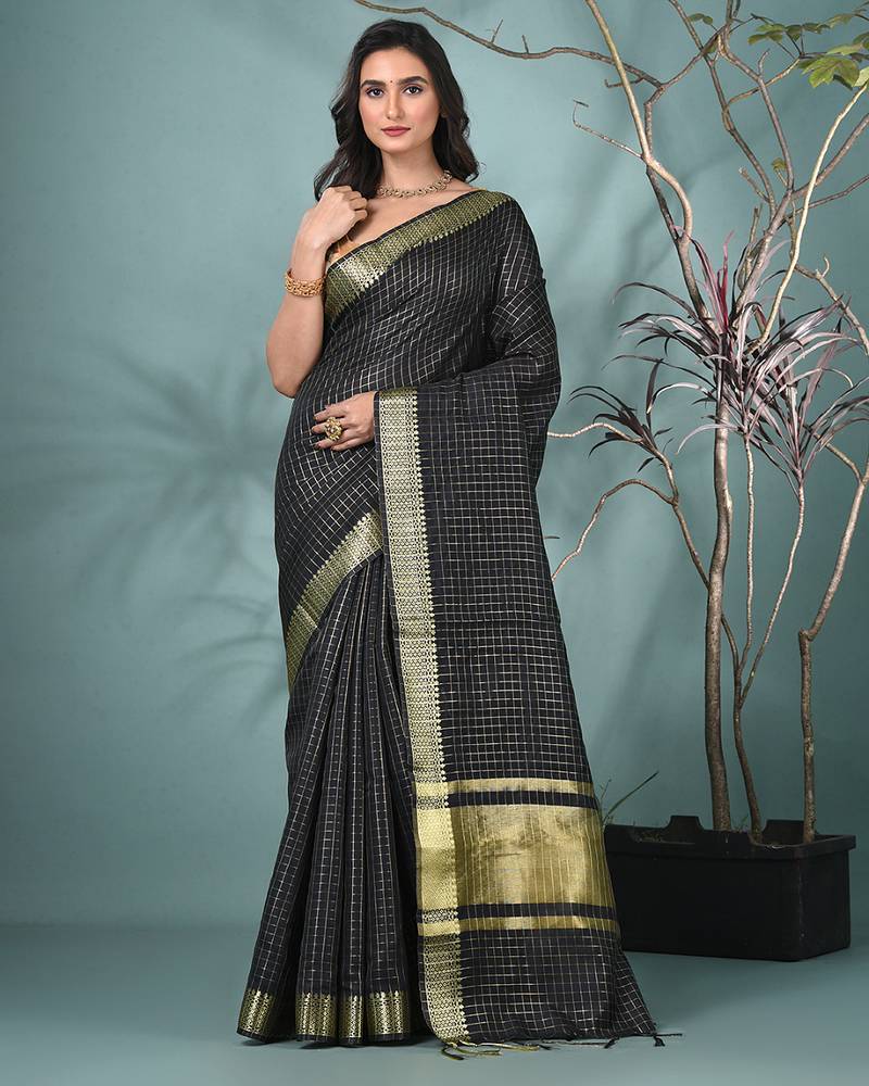 Black Catlon Soft Art Silk Saree With Checkered Pattern