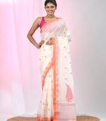 This graceful Off White Tant Saree offers a serene and sophisticated look with its soft pink and orange leaf borders. The delicate leaf motifs throughout the body of the saree add a subtle charm, making it perfect for a range of occasions. Crafted from breathable cotton, it provides both comfort and style, making it ideal for everyday wear, festivals, and intimate celebrations. The vibrant contrast between the borders and the soft white body ensures a timeless, yet modern appeal.
