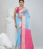 Step into timeless elegance with this exquisite sky blue resham saree, beautifully complemented by a striking pink pallu. The saree features intricate zari weaving along the borders and pallu, adding a rich traditional charm. Crafted from premium resham fabric, it drapes gracefully, making it perfect for festive occasions, weddings, and cultural celebrations. The contrast pink blouse piece enhances its vibrant appeal, ensuring you stand out with sophistication and style.