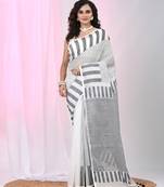 Elegant White And Black Striped Cotton Handspun Saree With Pom Pom Border