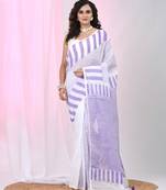 Elegant White And Violet Striped Cotton Handspun Saree With Pom Pom Border