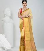Elegant Yellow And Gold Linen Saree With Striped Borders