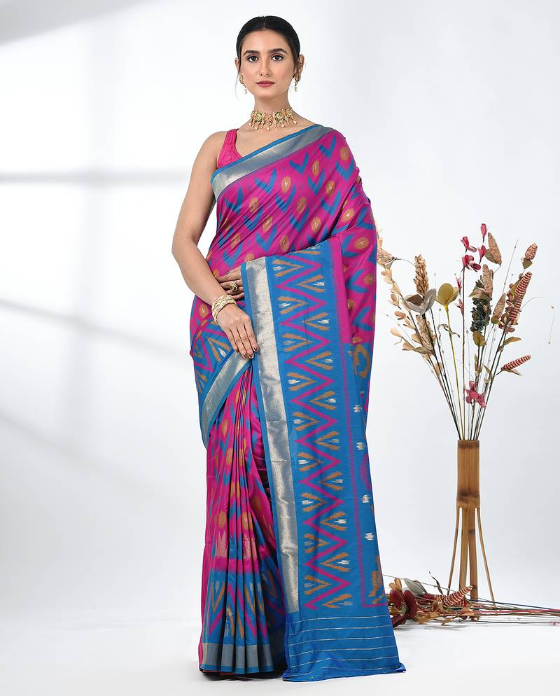 Exquisite Fuchsia Pochampally Silk Blend Saree With Vibrant Ikat Pattern