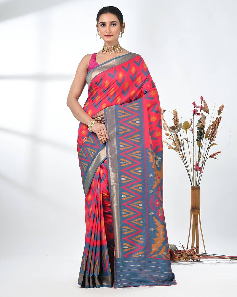 Celebrate tradition with a touch of elegance in this stunning Pochampally Silk Saree. The rich Pink hue forms a beautiful backdrop for the intricate and colorful Ikat patterns, weaving a tale of craftsmanship and heritage. The saree features bold geometric motifs in different shades of colors, creating a modern yet timeless appeal. Crafted from premium Pochampally silk, this saree offers a luxurious drape, perfect for weddings, festive occasions, or special celebrations. The golden zari border adds a regal touch, enhancing its overall charm. Pair it with matching jewelry and a statement blouse to complete your festive look.