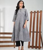 Introducing the sophisticated grey A-line kurta set, a meticulously crafted set ideal for both formal and festive occasions. This set's kurta features a mandarin neckline and three quarter sleeves for a polished look, with an A-line silhouette adding a touch of elegance. The button placket enhances the overall sleek design, while the trouser pant ensures a comfortable and tailored fit. Designed from a luxurious cotton, this set featured solid pattern that offers refinement and style.
