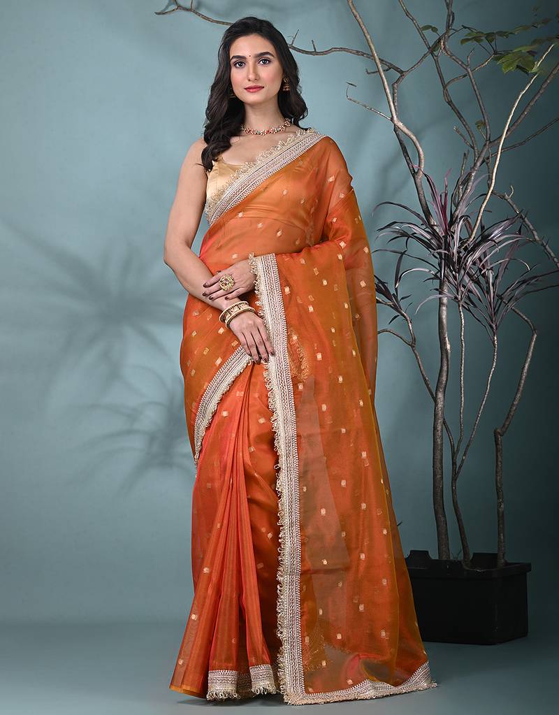 Elevate your festive wardrobe with this stunning orange tissue saree, designed to captivate attention at any special occasion. Crafted from premium tissue fabric, this saree offers a graceful sheen and lightweight feel, perfect for celebrations. The intricate Gotapatti work along the borders adds a touch of traditional elegance, making it a standout piece for weddings, parties, and cultural events. The saree is designed with timeless appeal, featuring delicate motifs throughout the fabric that enhance its charm. The contrasting golden-hued border with Gotapatti embroidery brings a sophisticated richness to the overall look. Pair it with a chic blouse and statement accessories for a complete ensemble that blends modern flair with classic artistry.