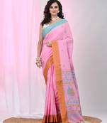 Add charm to your ethnic wardrobe with this elegant pink cotton saree, highlighted with a rich mustard border and contrasting blue pallu accent. The saree features woven leaf motifs and patterned detailing that bring out a graceful traditional appeal. Crafted from breathable cotton, it drapes effortlessly and ensures comfort throughout the day. Perfect for festive occasions, cultural gatherings, and office wear, this saree blends classic elegance with modern style.
