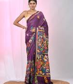 Purple Silk Blend Kantha Stitch Saree With Multicolor Thread Work