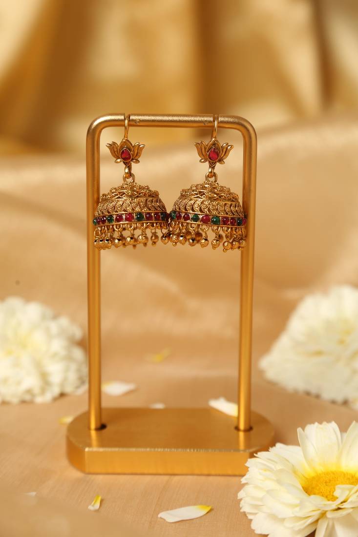 crafted in an antique gold finish, these jhumka earrings are highlighted with red and green stones. the layered dome design creates a bold traditional look. ideal for festive wear, these earrings offer durability, rich detailing, and a striking ethnic style statement.