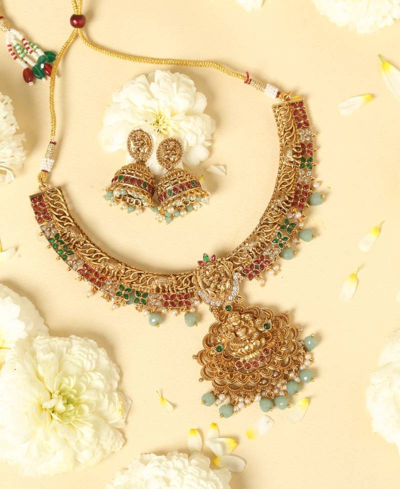 embrace divine heritage with this antique-finish temple jewelry set. the heavy pendant showcases an intricate goddess lakshmi motif, surrounded by ruby and emerald-hued stones and clustered pearl drops. the detailed craftsmanship extends to the matching jhumkas, making this regal set an ideal statement piece for brides and grand occasions.