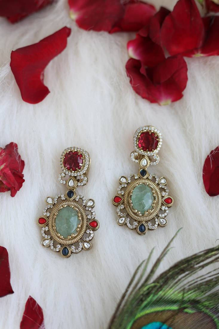 Capture the charm of a bygone era with these Antique Gold Vintage-Style earrings. Featuring a unique combination of ruby-red and jade-green stones set in a matte gold finish, they are accented with tiny sapphire-blue crystals. These heirloom-inspired earrings add a touch of retro sophistication to any ensemble.