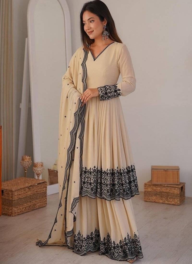 Embrace timeless elegance with this Beige-colored Palazzo suit, a masterpiece of Indian ethnic wear. Crafted from breathable faux-georgette, the flared silhouette features intricate black thread-work borders and delicate motifs. Perfect for weddings or festive gatherings, this ensemble includes a matching dupatta and floor-length Palazzo for a graceful, royal look.