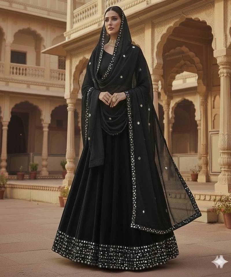 • Style : Circular Lehenga • Fabric : Georgette • Color : Black • Work : Embroidered Dupatta Details