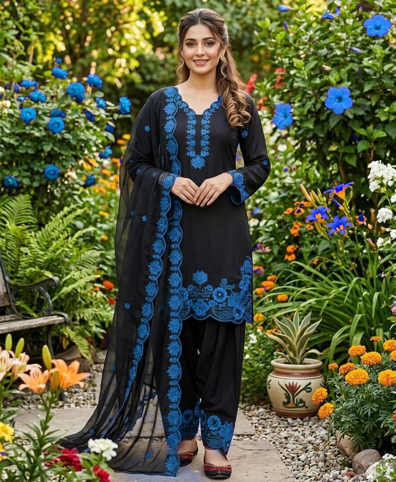 If you find the product for less we'll match it! Know MoreAdd a modern twist to tradition with this black kurta set featuring vibrant blue embroidery and intricate patterns. Designed for both comfort and elegance, it includes matching bottoms and dupatta. Perfect for festive gatherings, casual celebrations, and stylish ethnic wear with a contemporary edge.