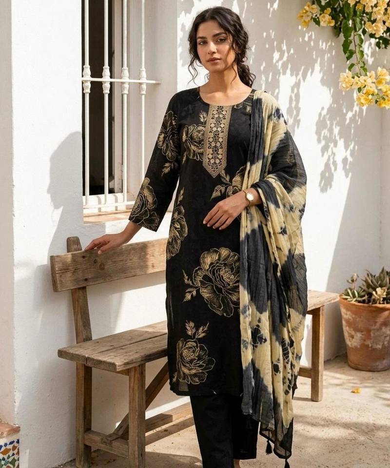 • Product Id : 4739639 • Package Details : 1 Top : 1 Bottom : 1 Duppata • Type : Kurta Sets • Occasion : Casual • Fabric : Poly • Work : Printed • Type : Floral Print • Look : Contemporary • Sleeve : Quarter Sleeve • Neck Style : Round Neck • Color : Black • Stitching : Stitched • Length : 43.0 • Side Slit : Yes General - Color and Texture may have slight variation. This happens because of photography.
