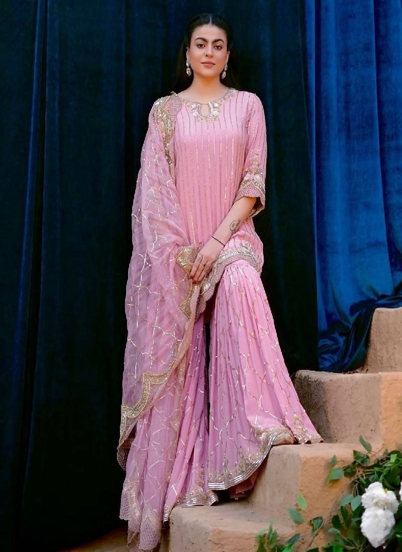 beautiful blush pink sharara suit designed with delicate golden embroidery and elegant detailing. the stylish kurta pairs with flowing sharara pants and a matching dupatta. perfect for weddings, festive parties, and celebrations where soft colors and graceful design create a feminine ethnic look.