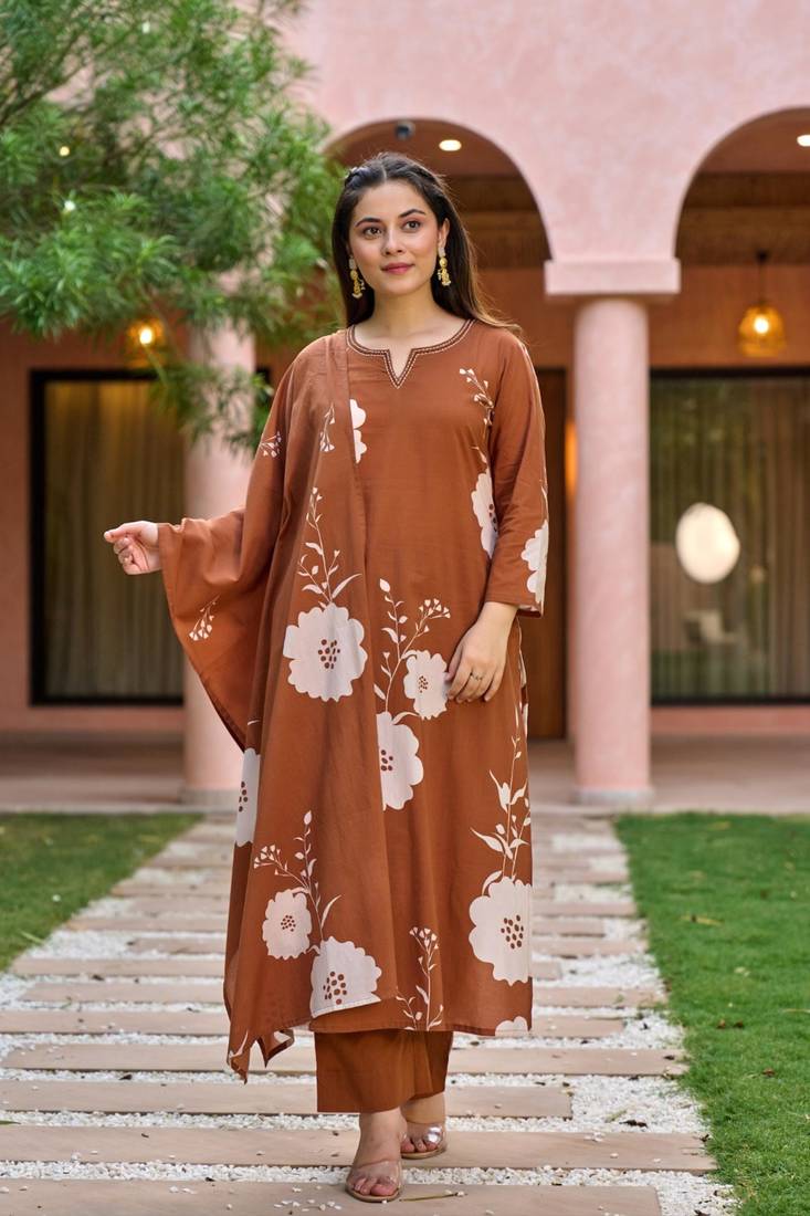 If you find the product for less we'll match it! Know MoreInfuse your wardrobe with earthy tones in this terracotta brown kurta set. The mid-length tunic showcases oversized cream floral motifs and a delicate embroidered V-neckline. Paired with coordinating tapered trousers, this lightweight cotton-blend ensemble is designed for the modern woman seeking effortless style and all-day comfort during daytime gatherings.
