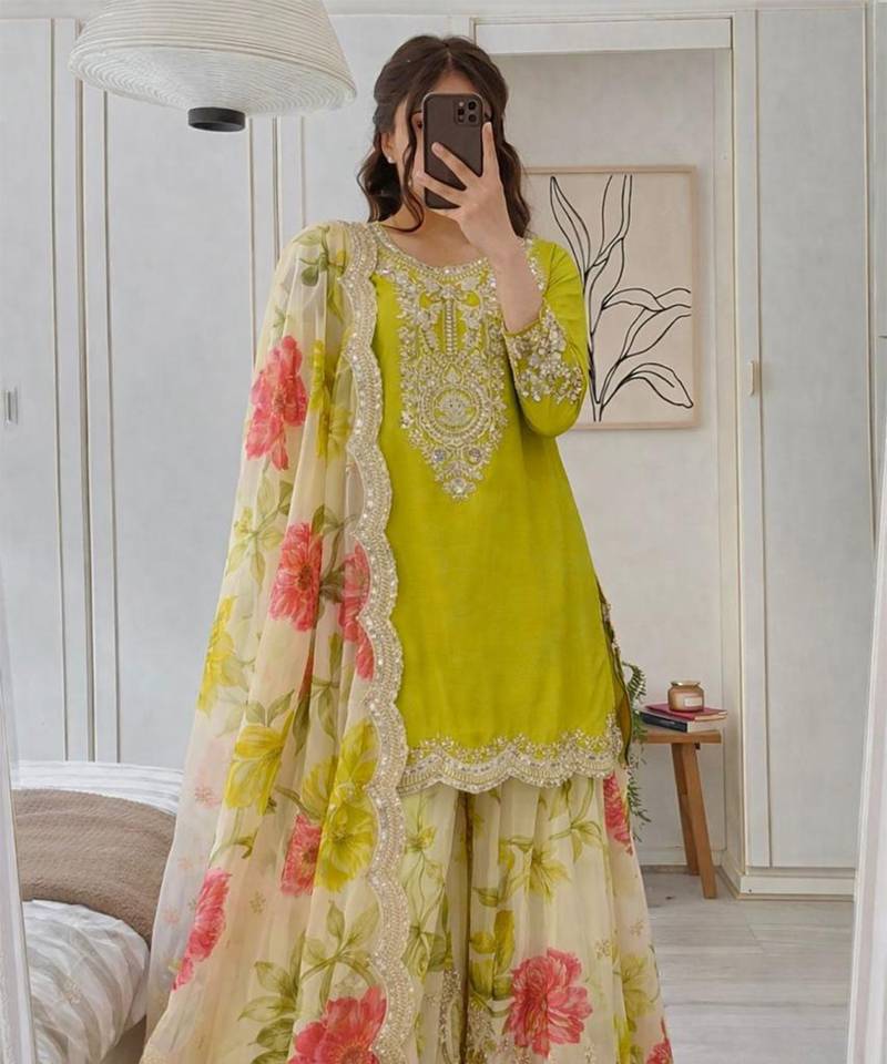 Chinon Lime Green & Floral Sharara Ensemble Stitched