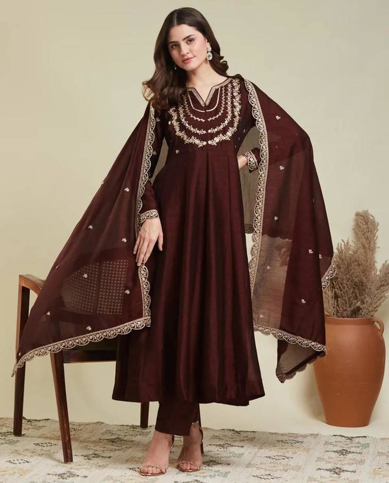 Elevate your festive wardrobe with this chocolate Anarkali kurta set featuring delicate embroidery on the neckline and flowing silhouette. Crafted from premium fabric, it offers a rich sheen and elegant drape. Paired with matching dupatta, this outfit is perfect for weddings, parties, and traditional celebrations.