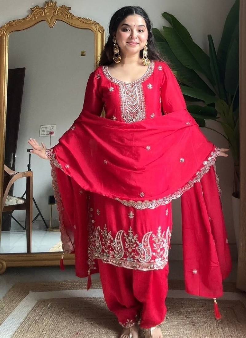 a timeless red salwar suit designed with delicate embroidery and elegant neckline detailing. paired with matching bottoms and a lightweight dupatta, this outfit offers a graceful festive appearance. perfect for family celebrations, festivals, and traditional gatherings that call for classic ethnic fashion.