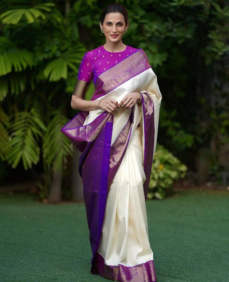 Discover timeless sophistication in this pristine cream-colored silk blend saree. Beautifully framed by a striking royal purple border featuring intricate metallic detailing, this visually captivating ensemble creates a stunning contrast. Exceptionally lightweight and gracefully fluid, it is the perfect selection for upscale daytime weddings and religious ceremonies.