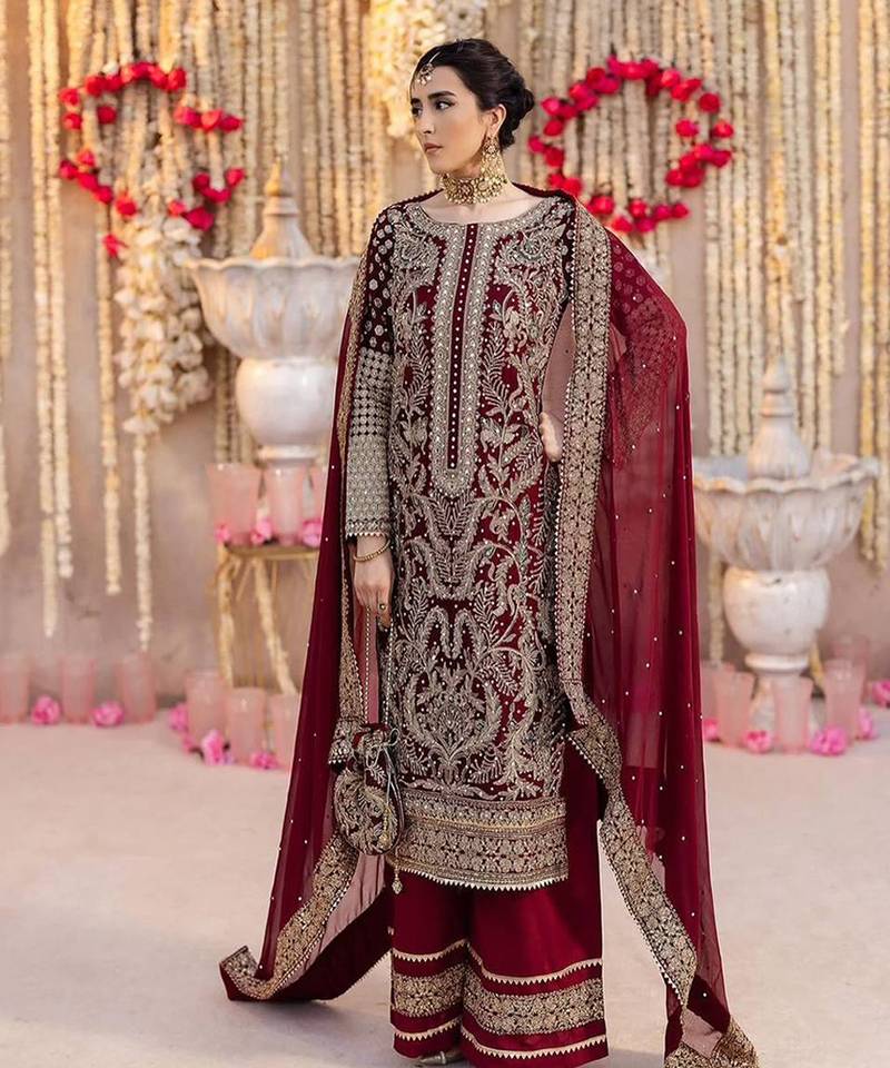 Discover the pinnacle of ethnic glamour with this unstitched crimson red suit. Characterized by dense silver tilla work and ornate floral patterns, this high-quality georgette set offers a rich, textured finish. The elaborate border designs on the sleeves and hemline ensure you stand out at every festive occasion or wedding.