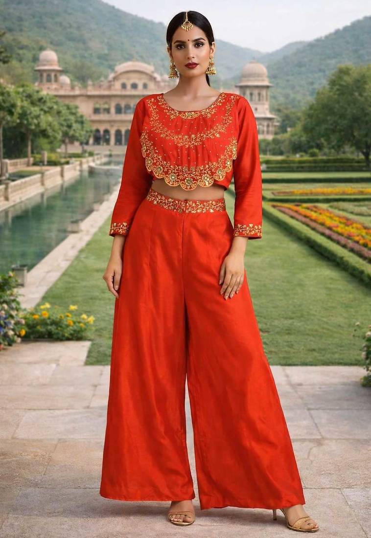 Trendy dark-orange top with intricate gold embroidery paired with wide palazzo pants. A fusion ethnic outfit perfect for mehendi, haldi, and festive celebrations.