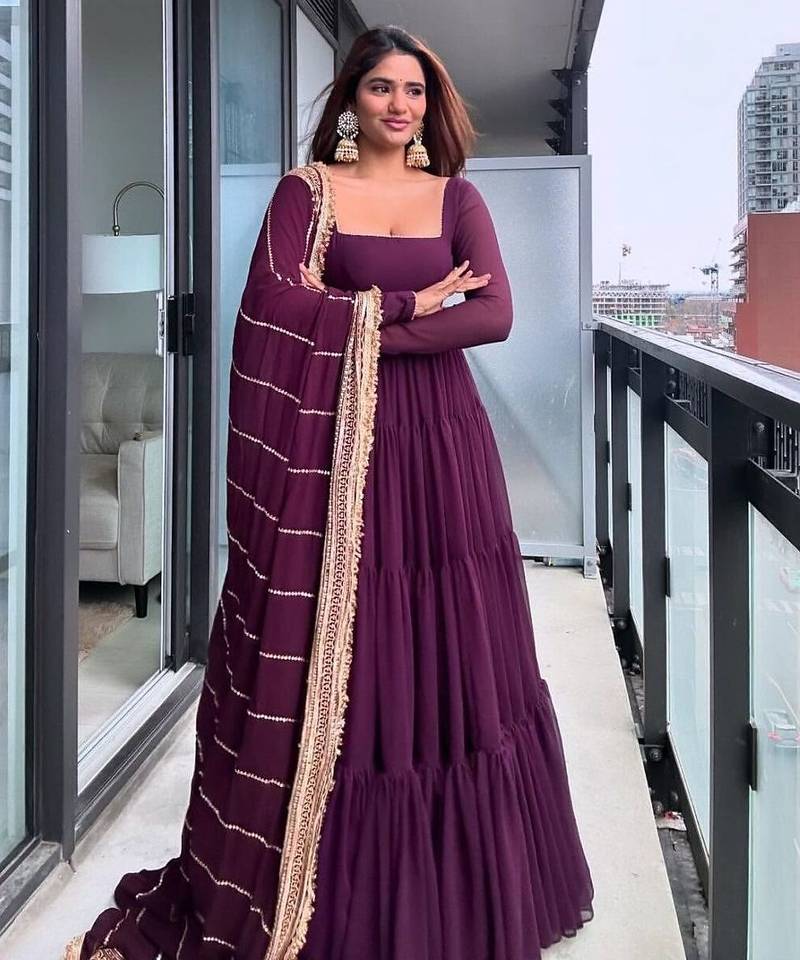 Make a statement in this exquisite deep wine georgette PADDED ANARKALI gown. The floor-length tiered silhouette offers a regal volume, while the square neckline adds a modern touch. It is paired with a matching dupatta featuring elegant gold border work, making it a perfect choice for evening galas and festive celebrations.