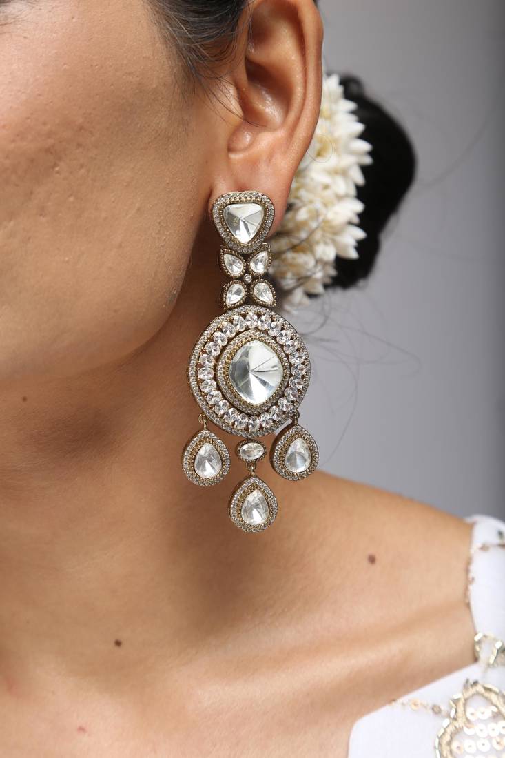 • Product Id : 4696505 • Package Details : 1 Pair Of Earrings • Type : Earrings • Occasion : Ceremonial • Look : Contemporary • Jewellery Work : American Diamonds • Color : White • Plating : Antique Gold • Base Material : Brass Payments [+]