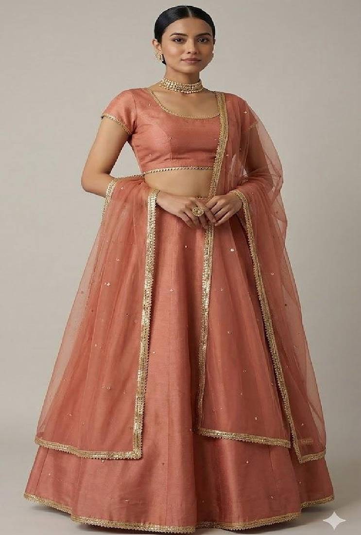 Elegant and refined, this dusty rose lehenga set includes a fitted blouse with delicate embellishments and a soft flowing skirt. The sheer dupatta with gold edging adds a sophisticated touch. Crafted from high-quality fabric, this outfit is ideal for weddings, engagements, and festive events.