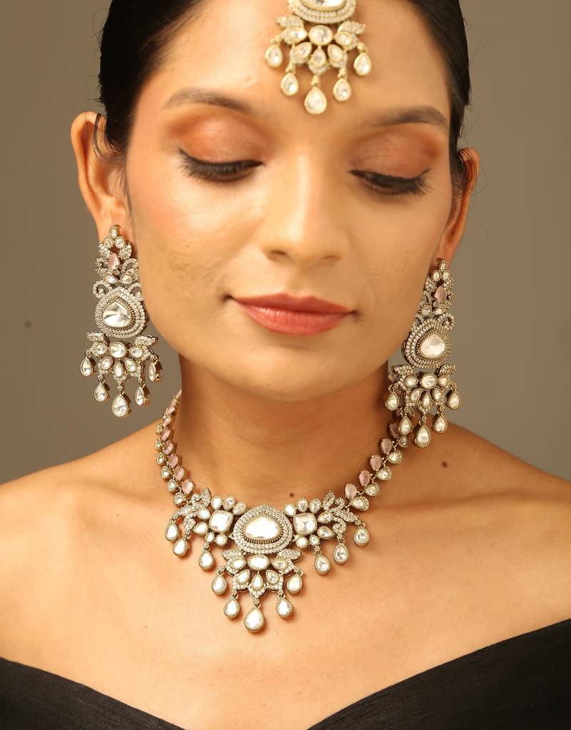 • Product Id : 4718248 • Package Details : 1 Necklace 1 Pair Of Earrings 1 Maang Tikka • Type : Necklace Sets • Occasion : Ceremonial • Look : Contemporary • Jewellery Work : American Diamonds • Color : White • Plating : Antique Gold • Base Material : Alloy Payments [+]