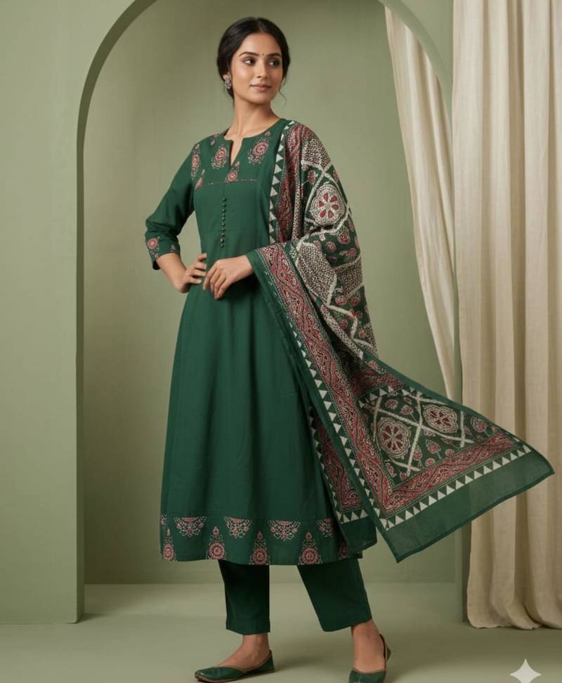 • Product Id : 4733660 • Package Details : 1 Top : 1 Bottom : 1 Duppata • Type : Kurta Sets • Occasion : Casual • Fabric : Cotton • Work : Printed • Type : Thread Work • Look : Contemporary • Sleeve : Quarter Sleeve • Neck Style : Round Neck • Color : Dark Green • Stitching : Stitched Payments [+]