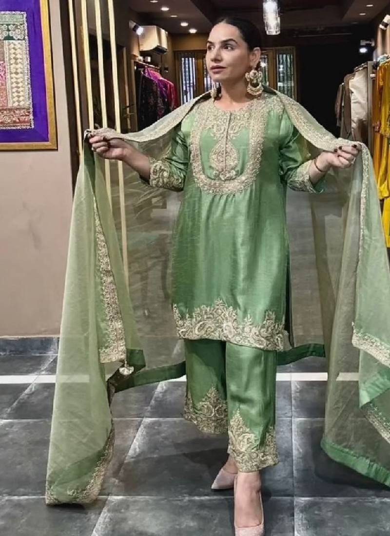 • Product Id : 4721697 • Package Details : 1 Top : 1 Bottom : 1 Duppata • Type : Kurta Sets • Occasion : Casual • Work : Embroidered • Type : Thread Work • Look : Contemporary • Sleeve : Quarter Sleeve • Neck Style : Round Neck • Color : Green • Fabric : Silk Blend • Stitching : Stitched • Length : 39 • Side Slit : Yes Payments [+]