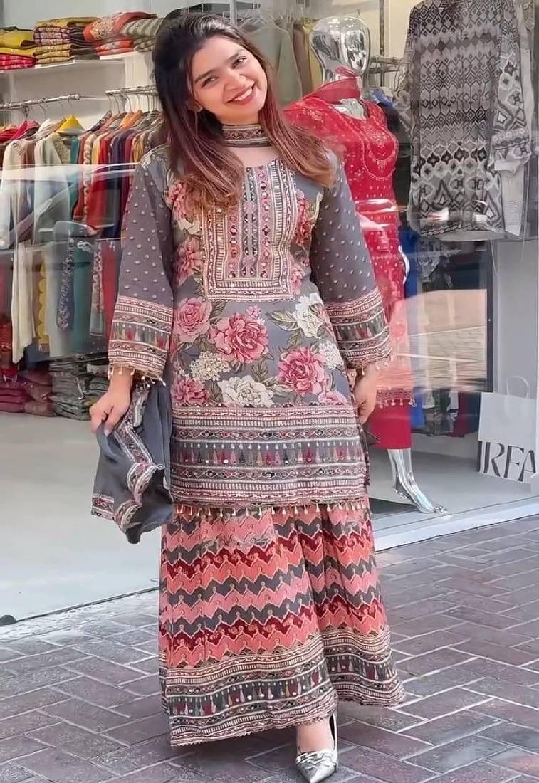 modern grey kurta set featuring floral and geometric prints paired with stylish sharara pants. the coordinated design blends contemporary patterns with traditional silhouettes. ideal for casual celebrations, festive gatherings, and fashionable ethnic styling with a comfortable and trendy appeal.
