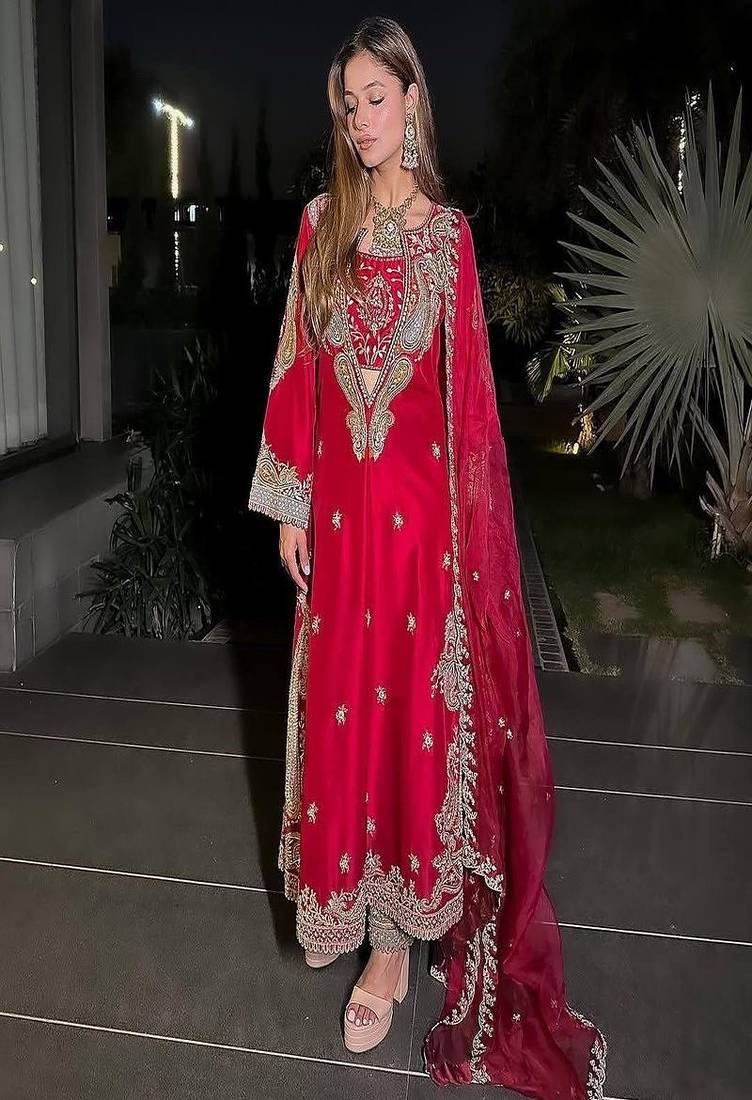 Turn heads in this hot-pink designer salwar suit with detailed gold embroidery and ornate borders. The luxurious fabric and matching dupatta create a striking silhouette. Perfect for weddings, evening parties, and festive celebrations, this outfit reflects timeless tradition and contemporary elegance.