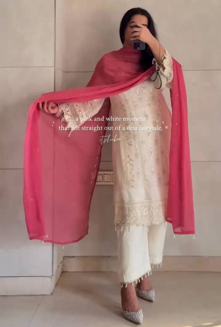 Exude celestial grace in this ivory georgette kurta, distinguished by its meticulous vertical lattice embroidery and shimmering sequin accents. The sheer sleeves feature ornate cutwork borders, perfectly complemented by a contrasting rich magenta dupatta. This opulent set is engineered for high-end evening galas where sophisticated craftsmanship is the primary focus.
