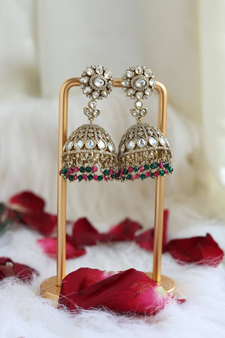 Celebrate heritage with these exquisite Jhumka earrings, featuring a classic dome design and floral-inspired studs. Adorned with clear Kundan stones and finished with a fringe of ruby and emerald-colored beads, they offer a festive pop of color. These timeless treasures are essential for completing any traditional bridal or bridesmaid look.