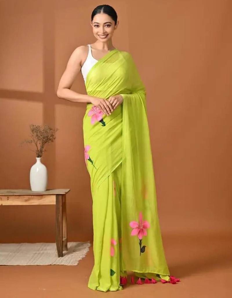 Radiate freshness in this vibrant lime green saree, featuring striking painted pink lily accents. The lightweight, sheer fabric drapes effortlessly, providing a modern twist on traditional floral aesthetics. Ideal for garden parties or brunch, this piece pairs beautifully with a simple white blouse for a clean, chic finish.