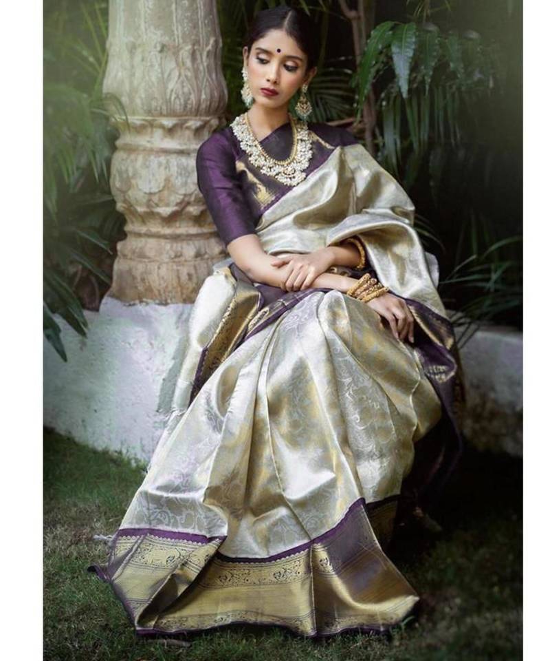 Exude royal charm in this breathtaking silver and cream silk blend saree. Showcasing highly intricate metallic woven patterns set against a contrasting deep purple border, this regal outfit drapes flawlessly. It is the ultimate statement piece for luxurious weddings and premium cultural events.