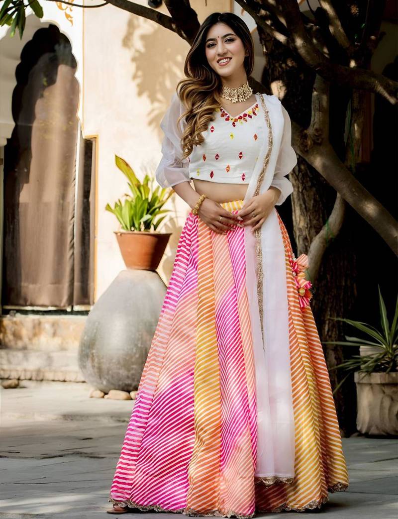 If you find the product for less we'll match it! Know MoreEmbrace vibrant traditions with this white and multi-colored leheriya stripe lehenga. The skirt features a stunning gradient of pink, orange, and yellow, beautifully balanced by a minimalist white embroidered blouse and a sheer organza jacket. This fresh, playful ensemble is perfect for Mehendi ceremonies and festive daytime celebrations.