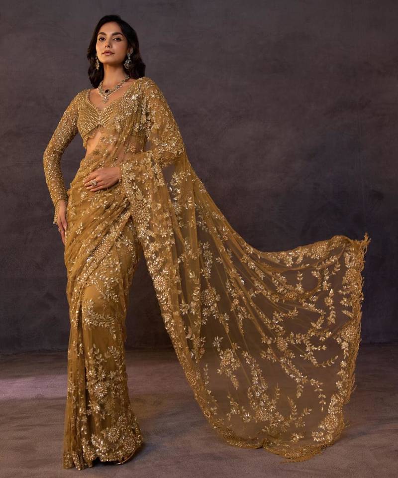 If you find the product for less we'll match it! Know MoreExude opulence in this mustard net saree, drenched in shimmering sequins and intricate zardosi handwork. The scalloped borders and floral vine motifs create a luminous effect under evening lights. Paired with a matching embroidered blouse, this luxury ensemble is designed for the modern woman who seeks a glamorous, ethereal look.