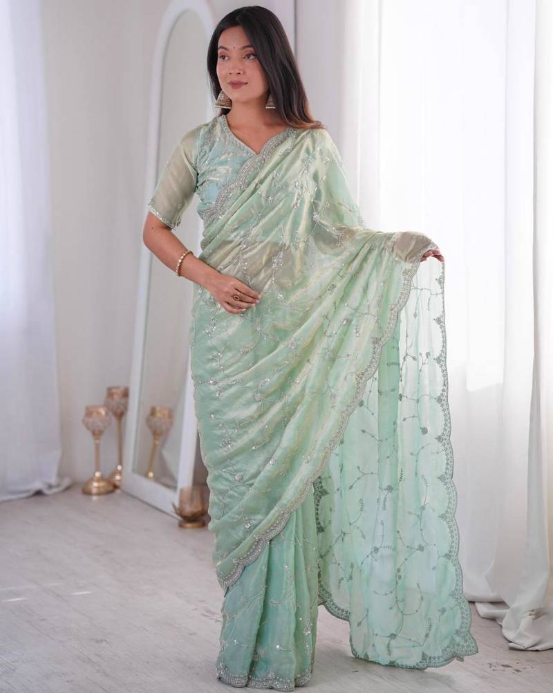 If you find the product for less we'll match it! Know MoreElevate your festive wardrobe with this ethereal olive saree. Crafted from a premium silk blend, it features delicate floral embroidery and shimmering silver sequins that catch the light beautifully. The lightweight fabric ensures a graceful drape, making it a perfect choice for weddings, evening receptions, or high-end cultural celebrations.