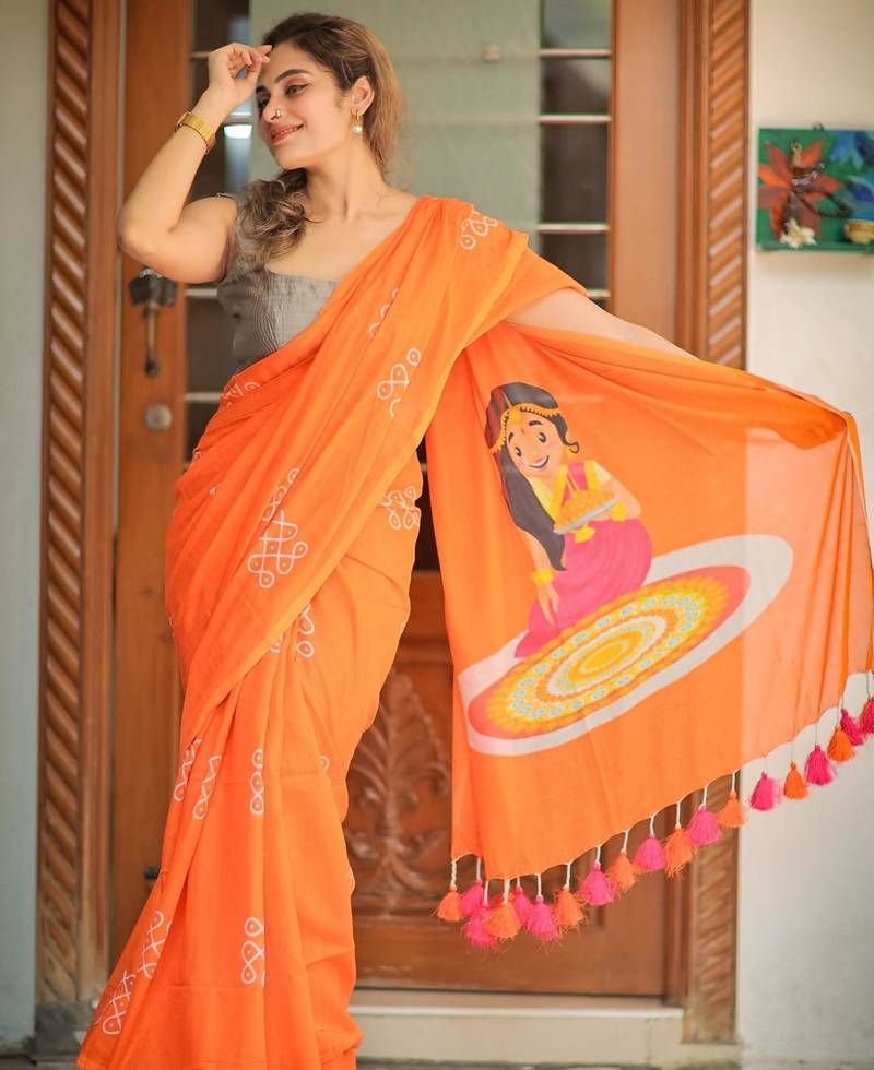 Radiate energy in this bright tangerine orange saree, detailed with traditional white geometric block prints throughout the body. The playful pink and orange tassels on the pallu add a whimsical touch to this high-contrast ensemble. Crafted for comfort, it is the perfect outfit for festive gatherings and summer cultural celebrations.