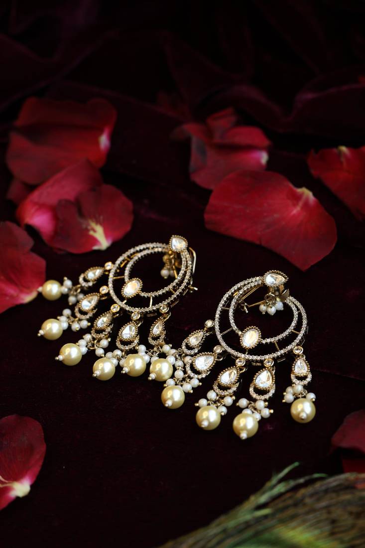 Experience the perfect harmony of crystals and pearls with these ornate circular earrings. Featuring concentric halos of shimmering stones and a delicate fringe of creamy faux pearls, they offer a refined, classic appeal. These earrings bring a touch of old-world glamour to modern festivities, pairing beautifully with diverse ethnic attire.