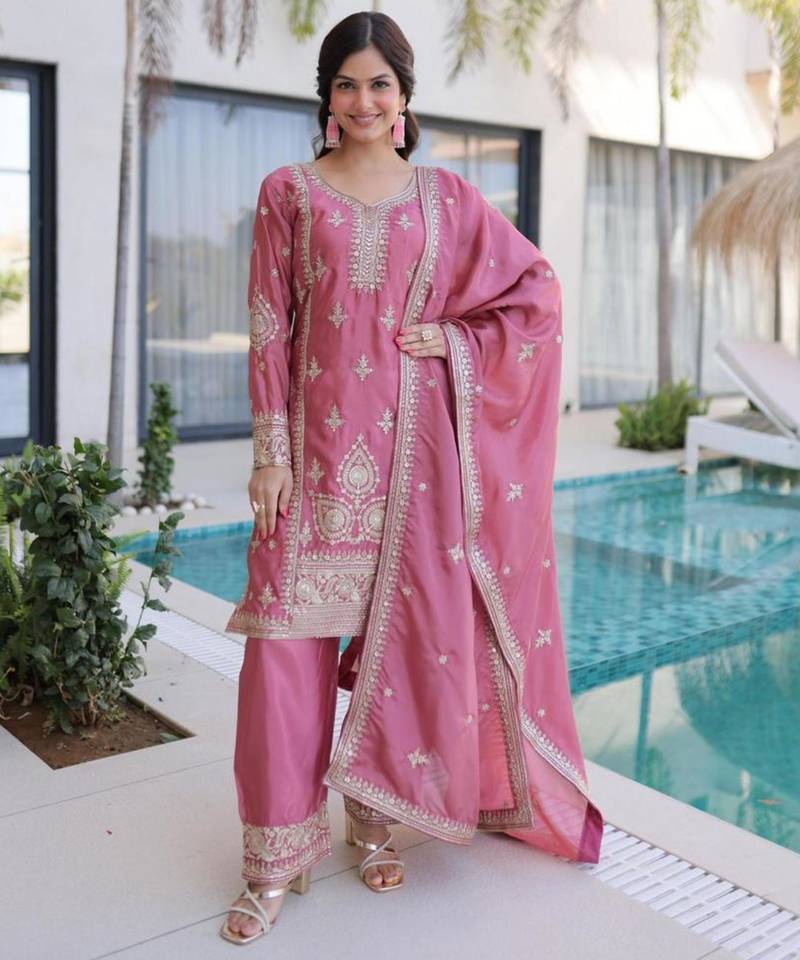• Product Id : 4735527 • Package Details : 1 Top : 1 Bottom : 1 Dupatta • Type : Salwar Kameez • Occasion : Ceremonial • Work : Embroidered • Type : Thread Work • Look : Designer • Sleeve : Full Sleeve • Neck Style : Round Neck • Color : Pink • Fabric : Silk Blend • Stitching : Stitched General - Color and Texture may have slight variation. This happens because of photography.