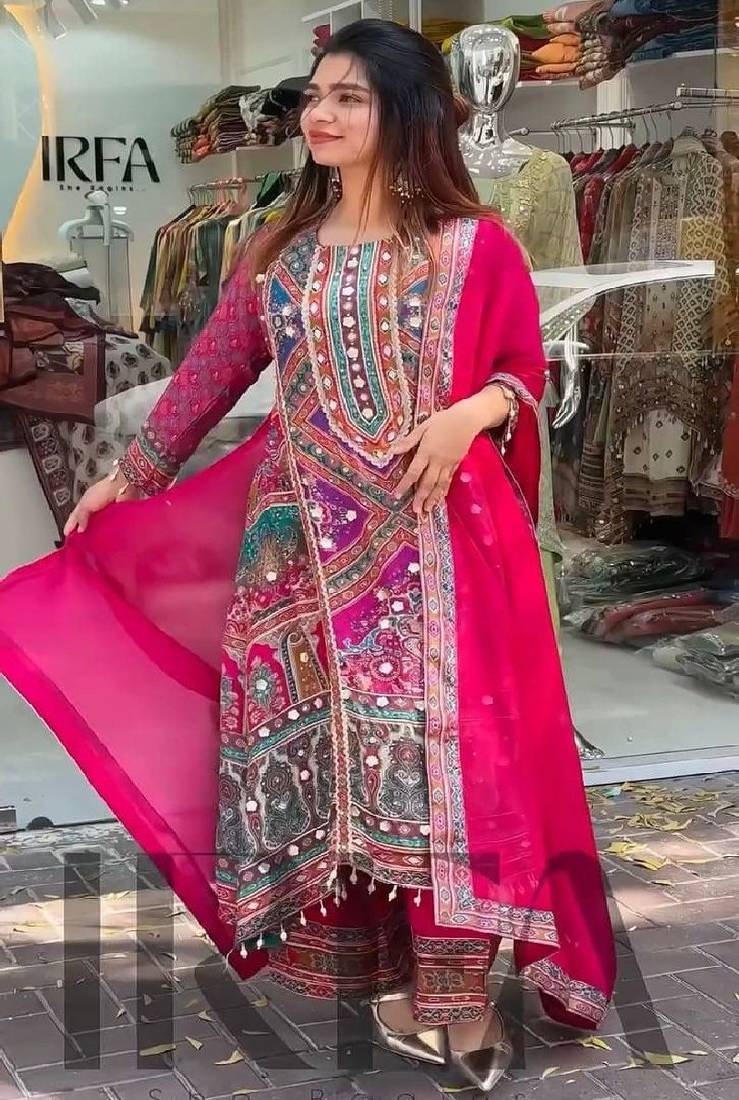 vibrant pink salwar suit featuring intricate multicolor traditional prints and mirror-style embellishments. the stylish kurta pairs with matching pants and a soft dupatta with detailed borders. perfect for festive gatherings, casual celebrations, and cultural events. lightweight fabric and artistic patterns create a lively and elegant ethnic look.