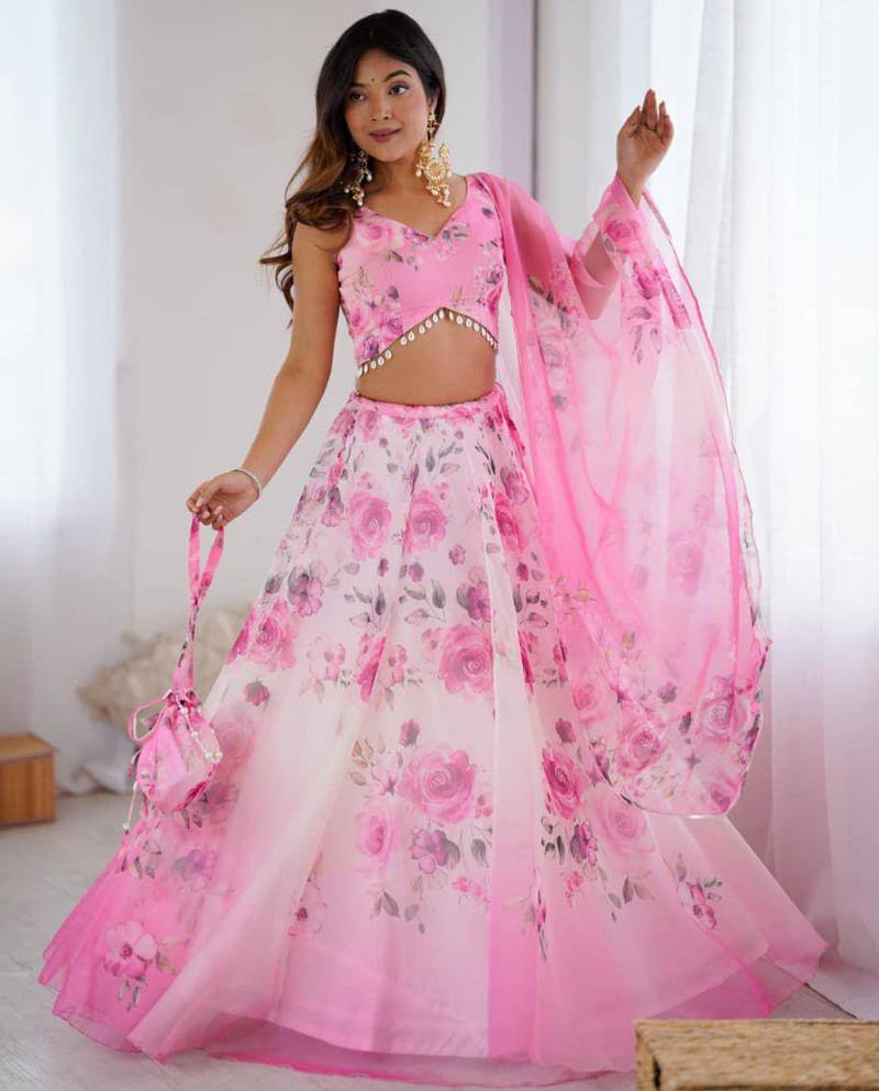 If you find the product for less we'll match it! Know MoreExperience ethereal charm in this white and pink floral print lehenga. Crafted from lightweight fabric, the set features romantic rose motifs and a unique scalloped-hem blouse with mirror accents. This feminine, airy ensemble is perfect for summer garden weddings, pre-wedding festivities, and high-end daytime celebrations.