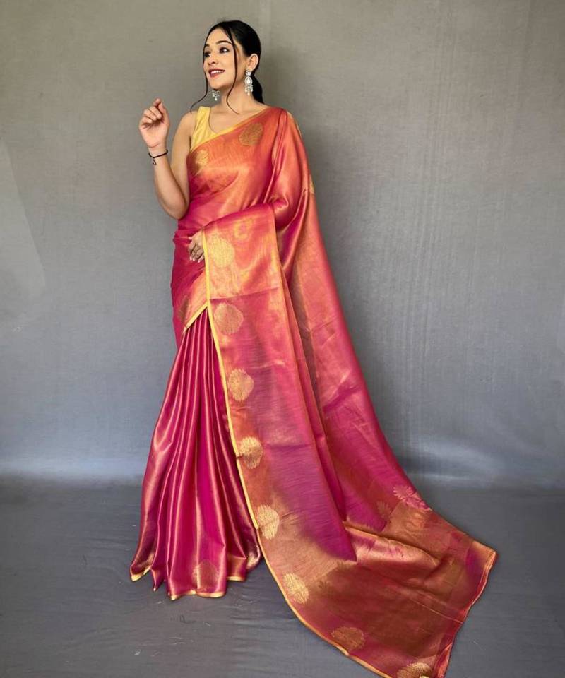 Pink Tissue Silk Zari Weaving Border Pallu Saree With Blouse